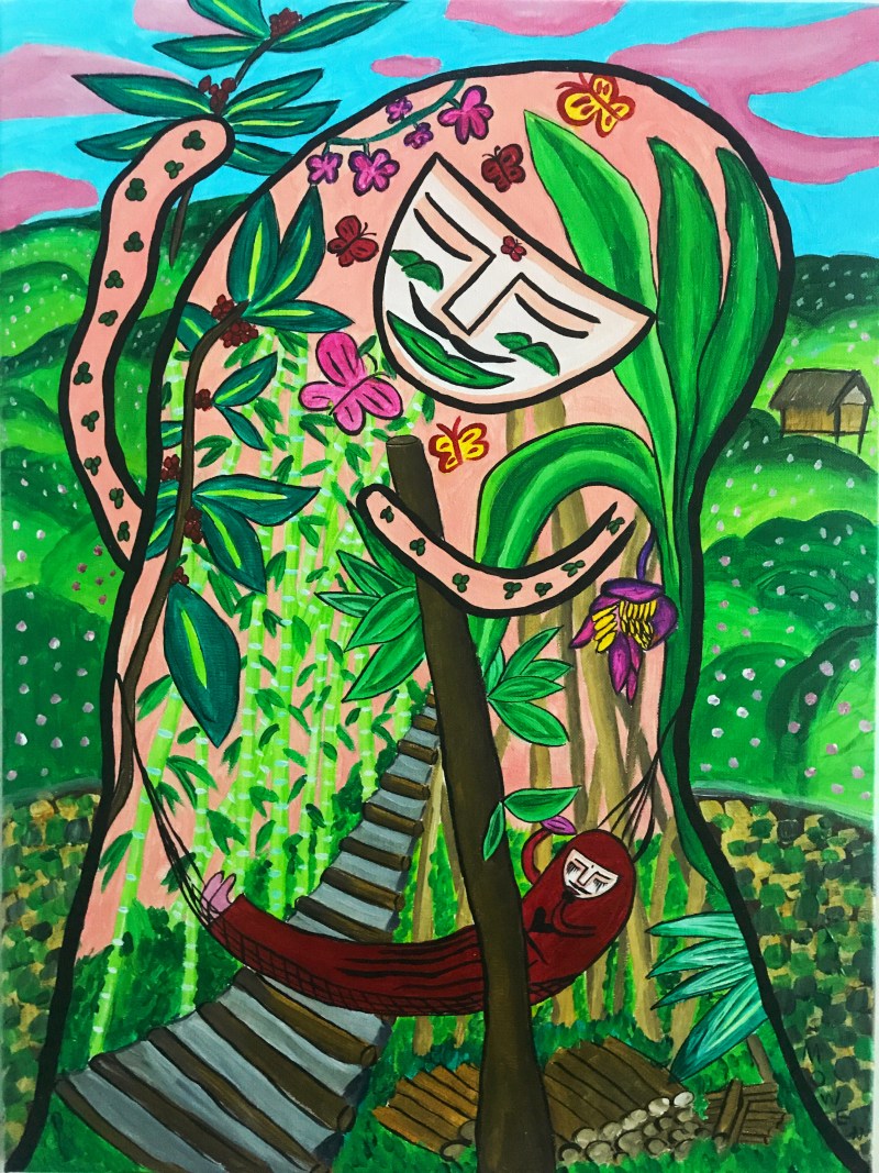 I did this painting after a tough hiking on an organic farm where they plant bananas and coffees, the green mountains and plants gave me so much energy and made me relax.